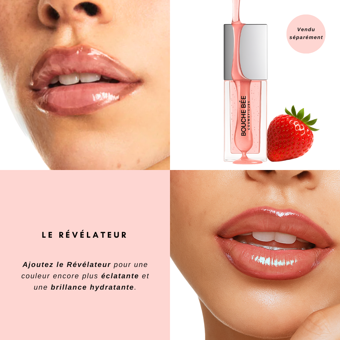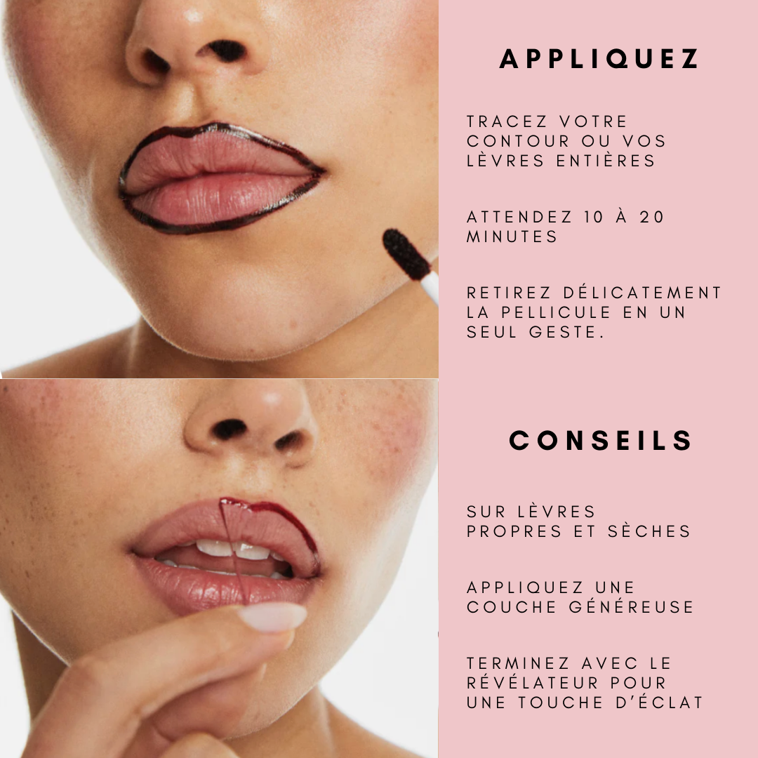 Retirez délicatement le film, puis appliquez le Révélateur Bouche Bée pour intensifier la couleur, lisser et illuminer vos lèvres.
